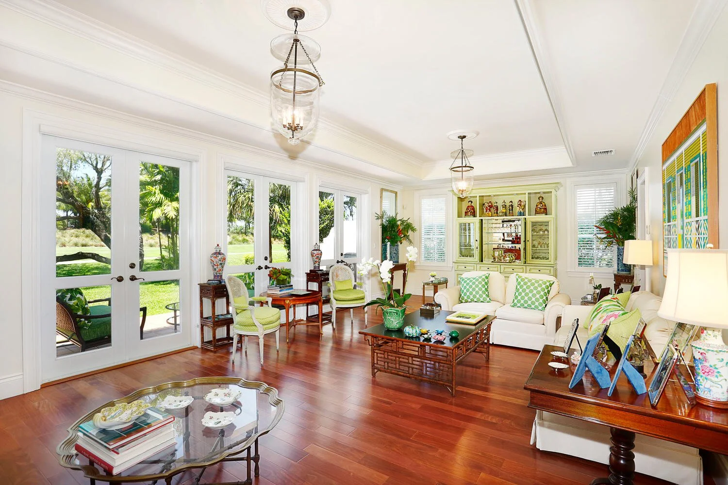Stunning great room with soaring ceilings and gorgeous moldings